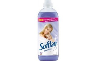 Aviváž Softlan Traumfrisch uklidňující vůně levandule - fialová barva. Usnadňuje žehlení. Dermatologicky testováno. Koncentrát 1 l odpovídá přibližně 5,3 l klasické aviváže.